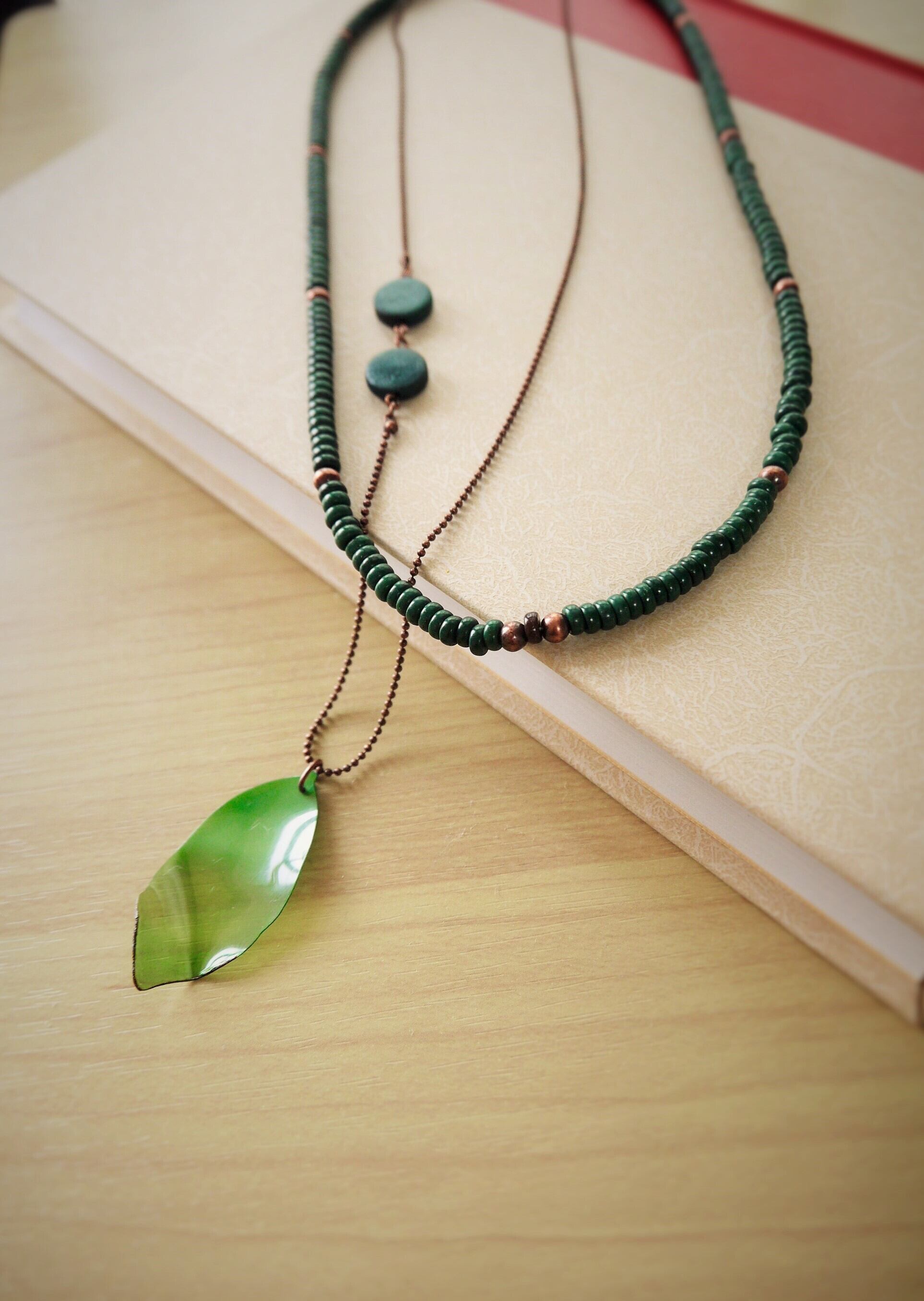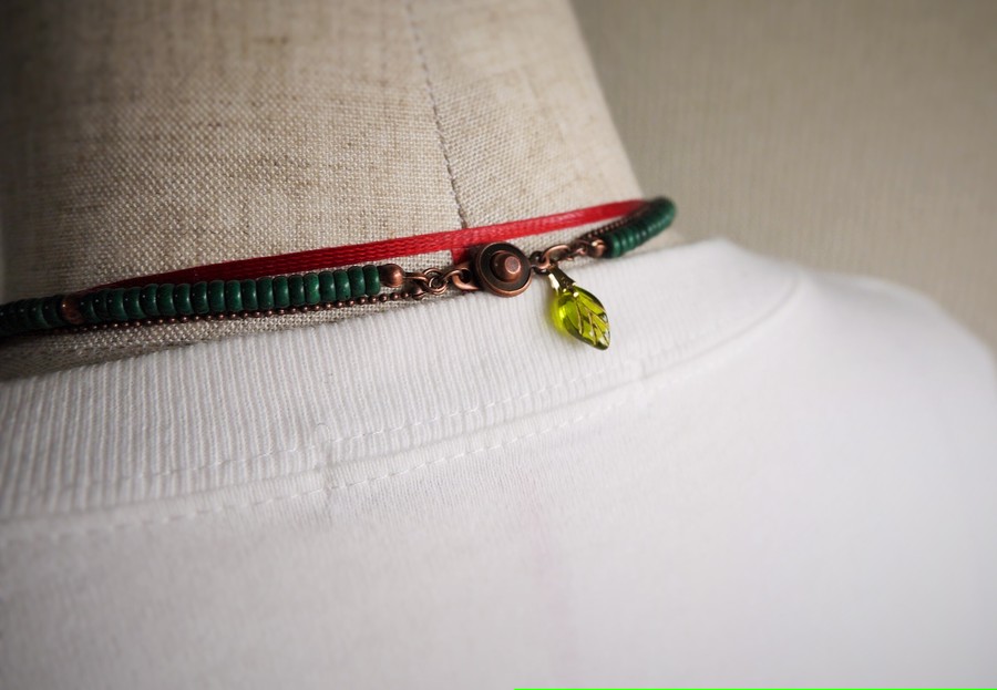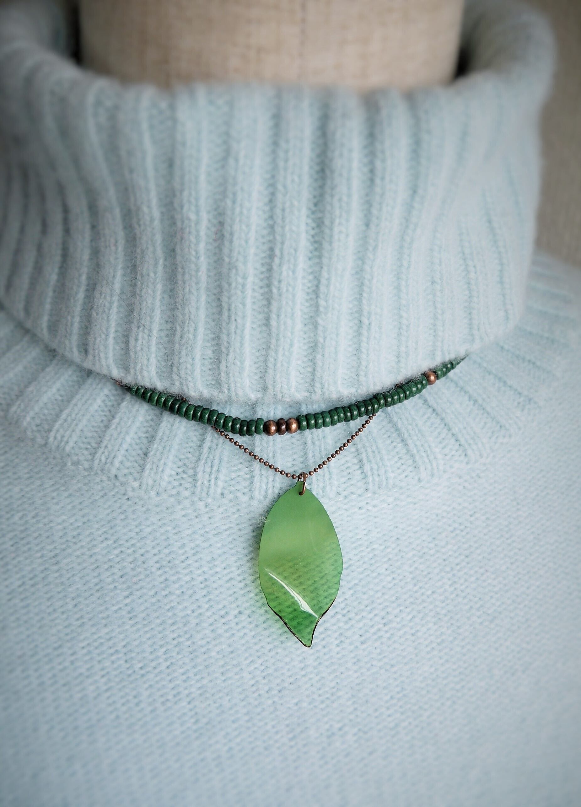 チャームに使った葉はスパンコール素材でとても軽く、熱を加えると色が透明になり、形を変えられます。