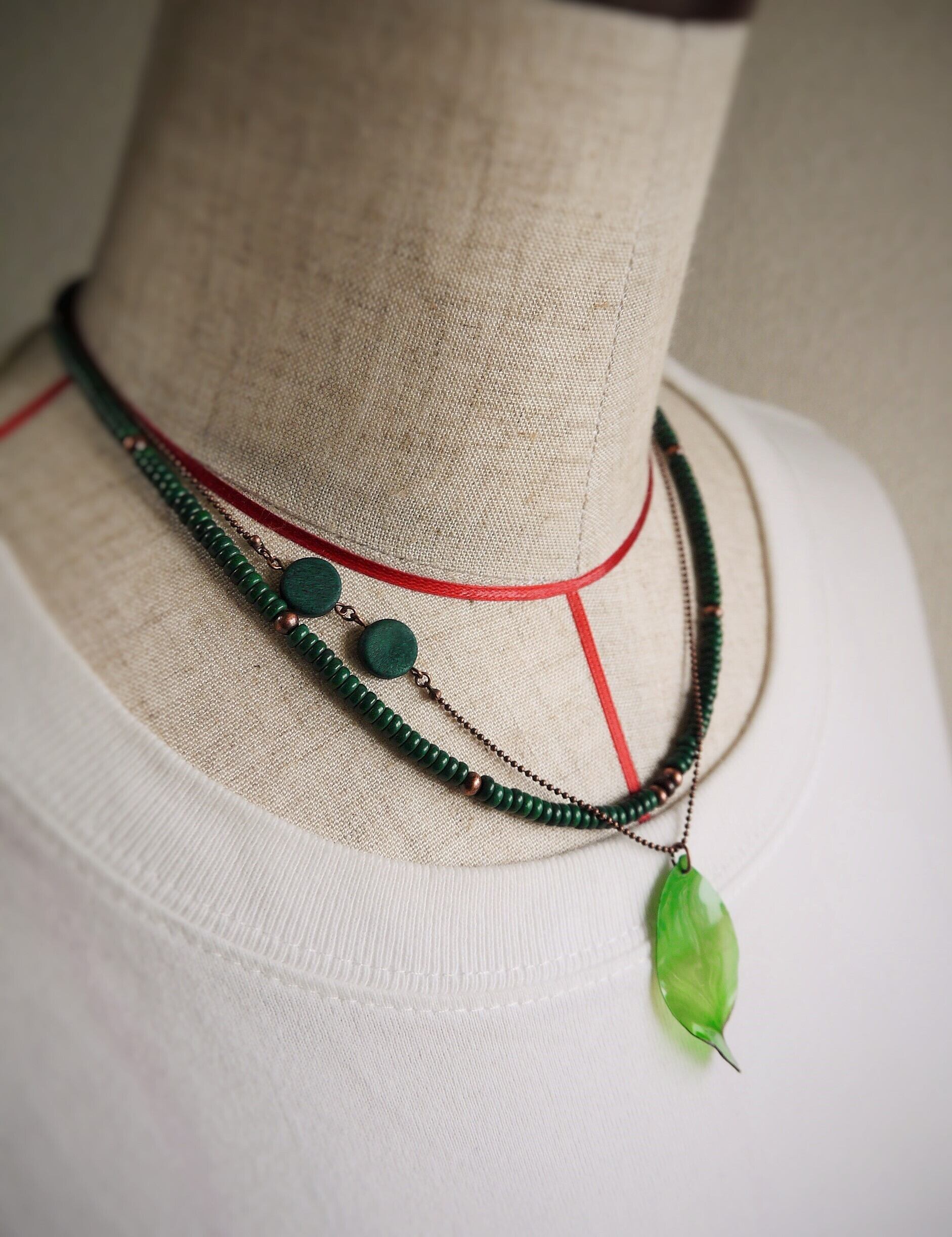 合わせたチェーンや金具類の色はアンティークブロンズなので、キラキラしたアクセサリーが苦手な方にも。