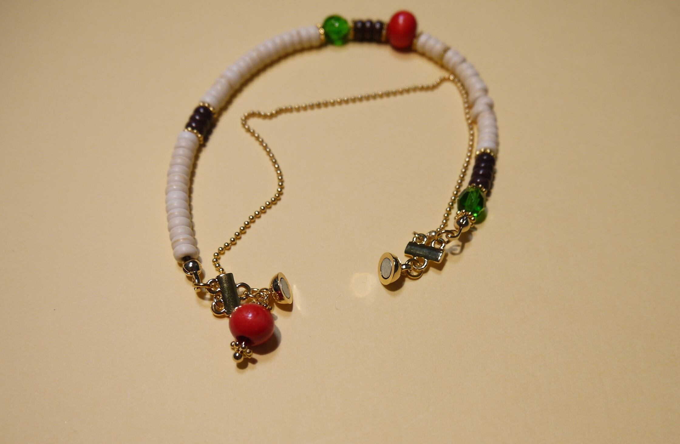 素材:マグネサイト(炭酸マグネシウム)、ウッドビーズ、真鍮、チェコビーズ、マグネット(留め具)