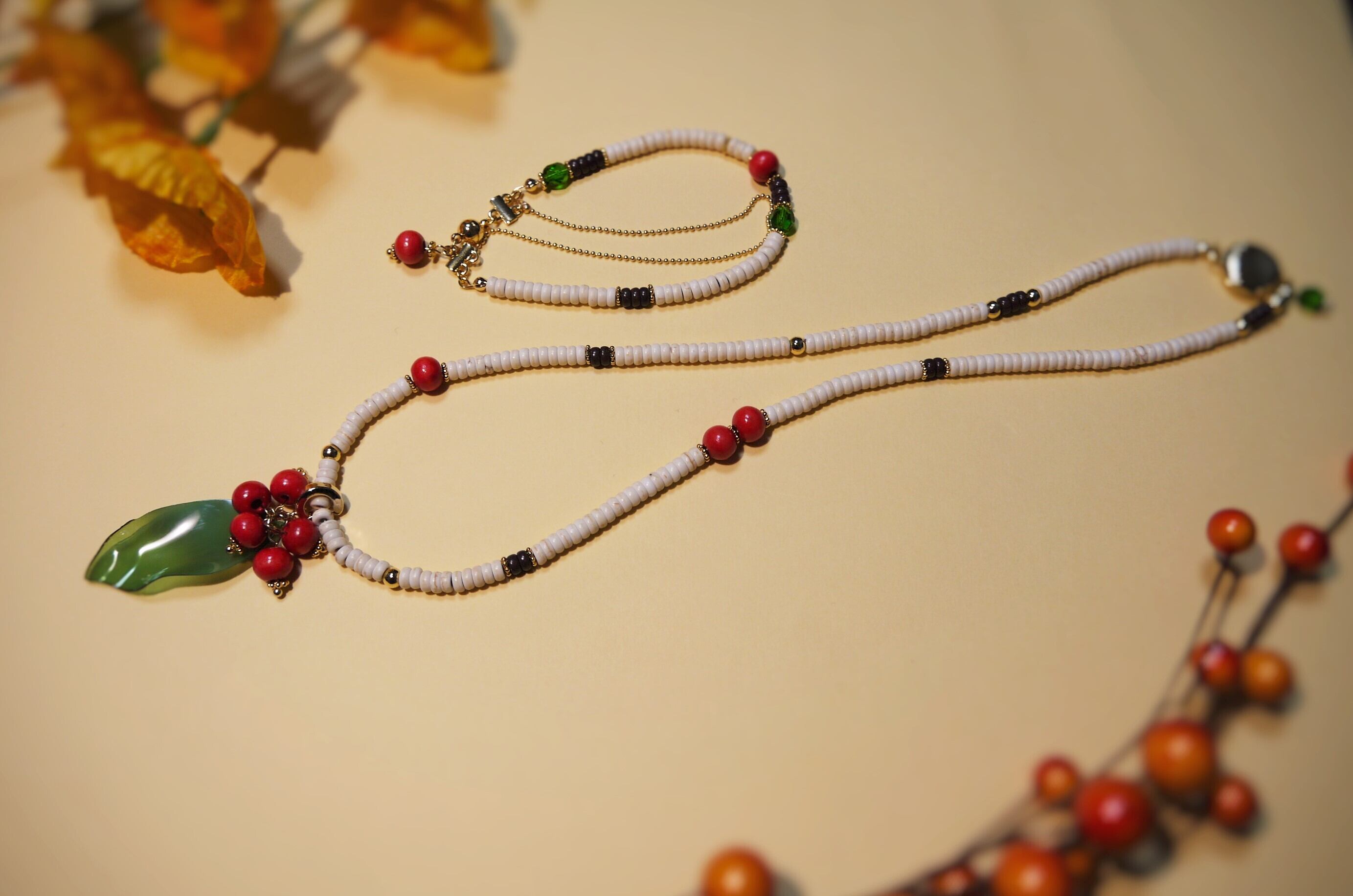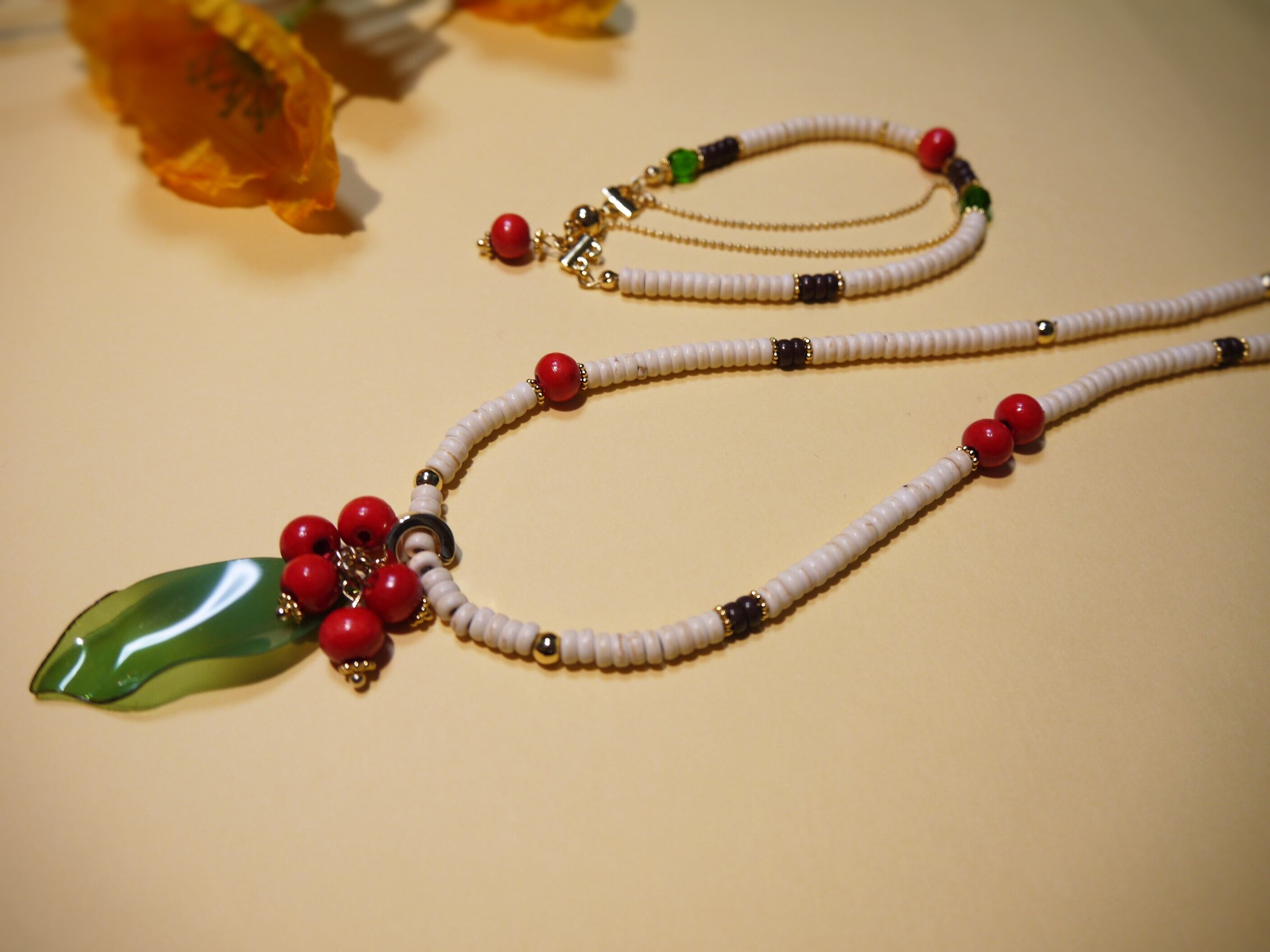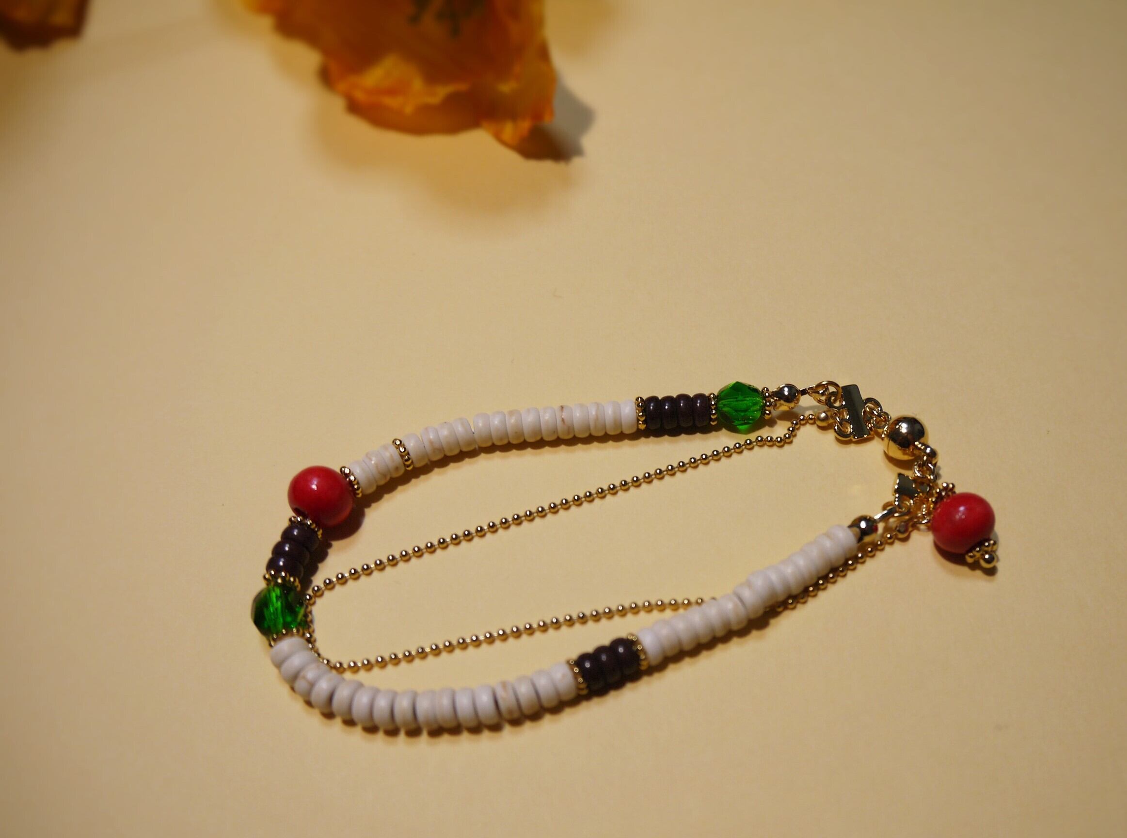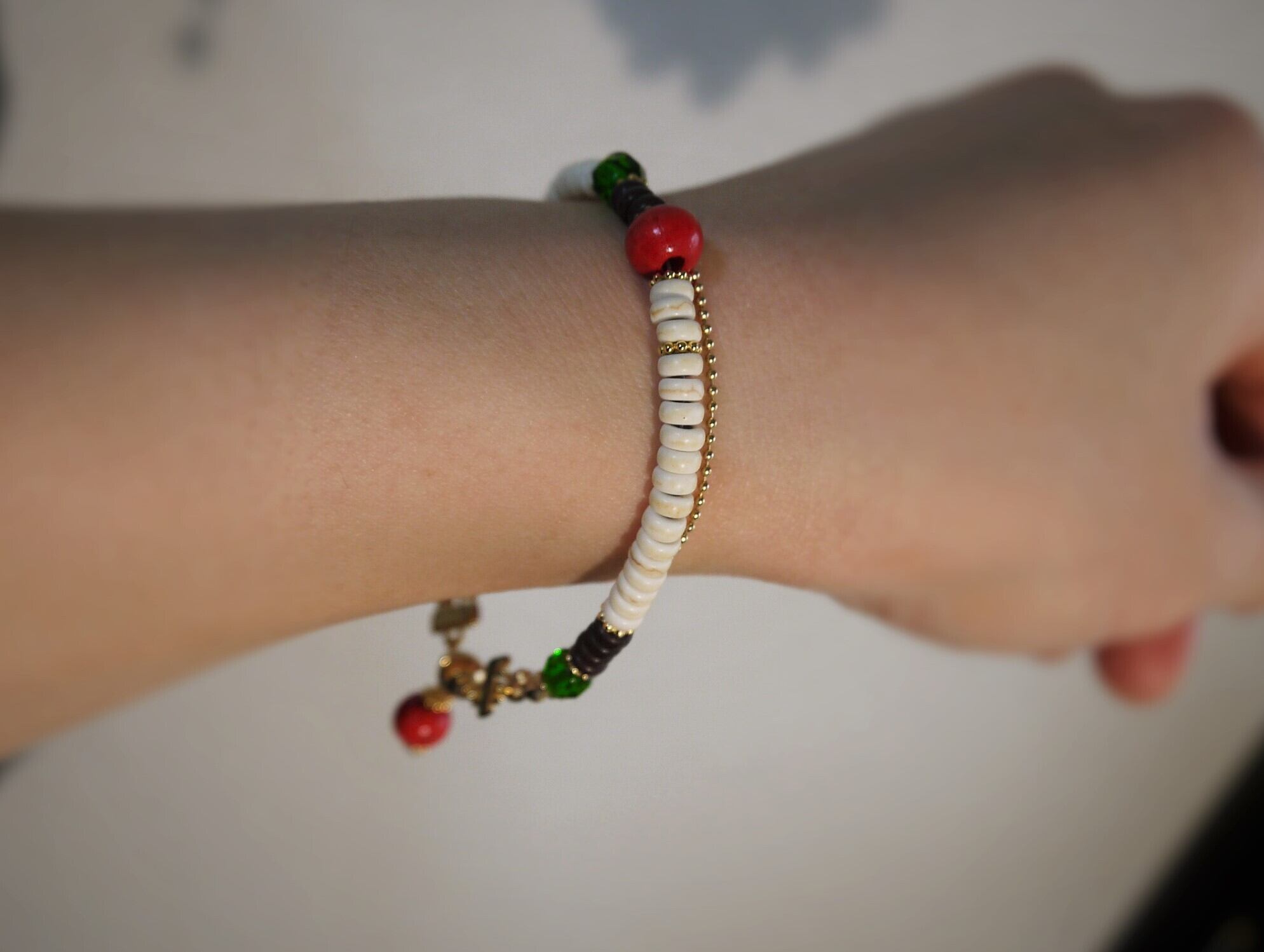 ウッドビーズの赤い実と、エメラルドグリーンのチェコビーズが鮮やかなブレスレットです。ウッドビーズはわずかに色ムラがあり、本物の木の実のような質感です。